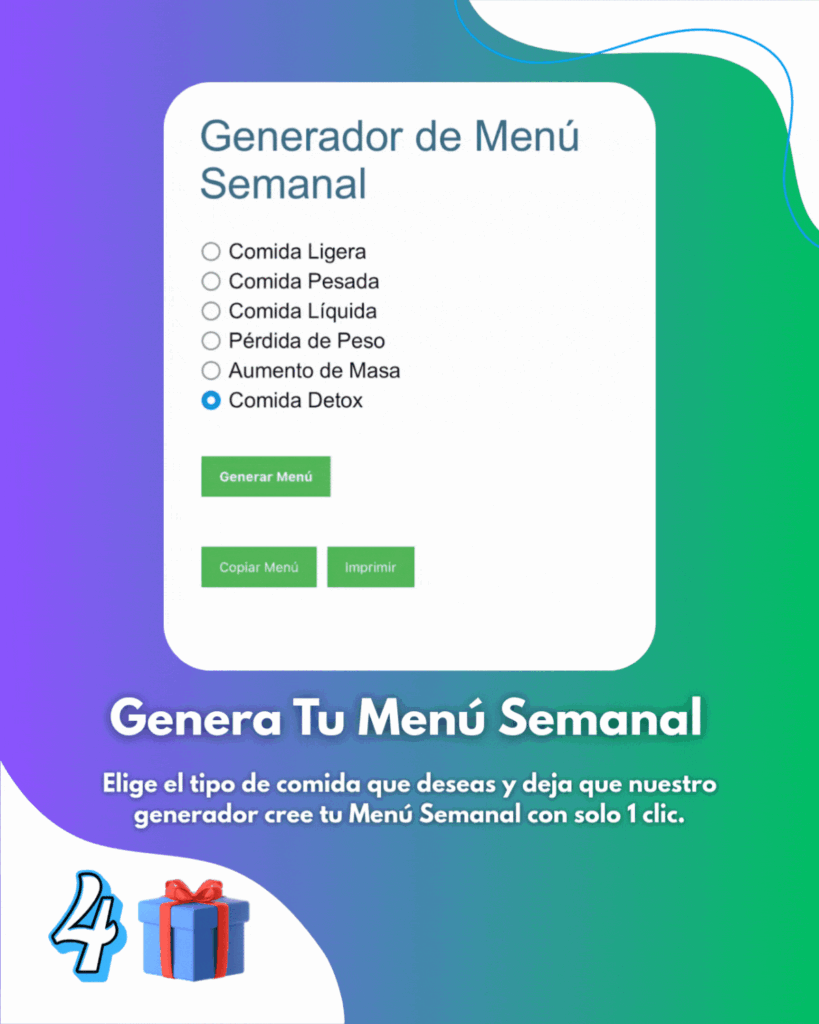 Recibirás un plan de 7 días listo para usar con desayuno, almuerzo, cena, refrigerios y bebidas, todo basado en las 200 recetas del manual. Solo síguelo y adáptalo a tu rutina.